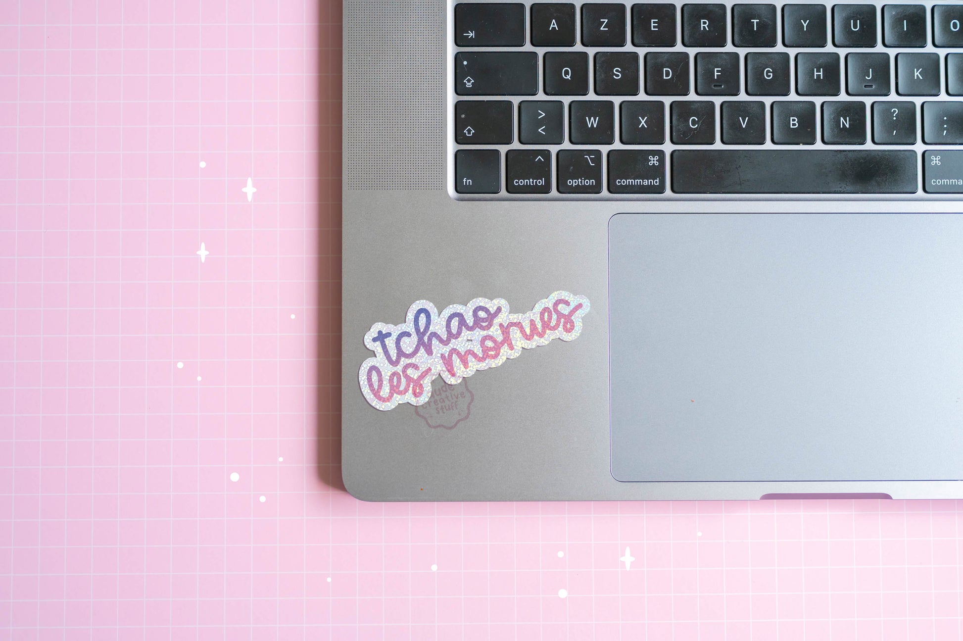 Le Sticker Citation Rigolote "Tchao les morues" Holographique est un autocollant premium au dégradé violet et fuchsia, sublimé par un effet holographique pailleté qui brille à chaque mouvement 🌈. Avec sa taille d’environ 3x7 cm, il est idéal pour celles qui aiment décorer leurs objets du quotidien avec une touche humoristique et originale : téléphone, ordinateur, gourde, casque de vélo ou carnet 📔.