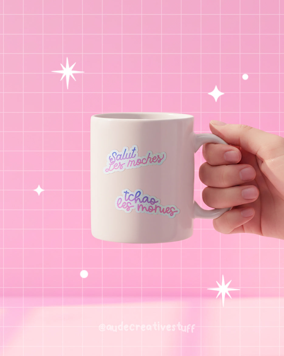 👉 Et si tu veux compléter la famille, découvre aussi les stickers “Salut les moches” et “Oh Putain”, disponibles en format classique et en version XXL (~30 cm), parfaites pour ton ordinateur ou ton atelier 😍.